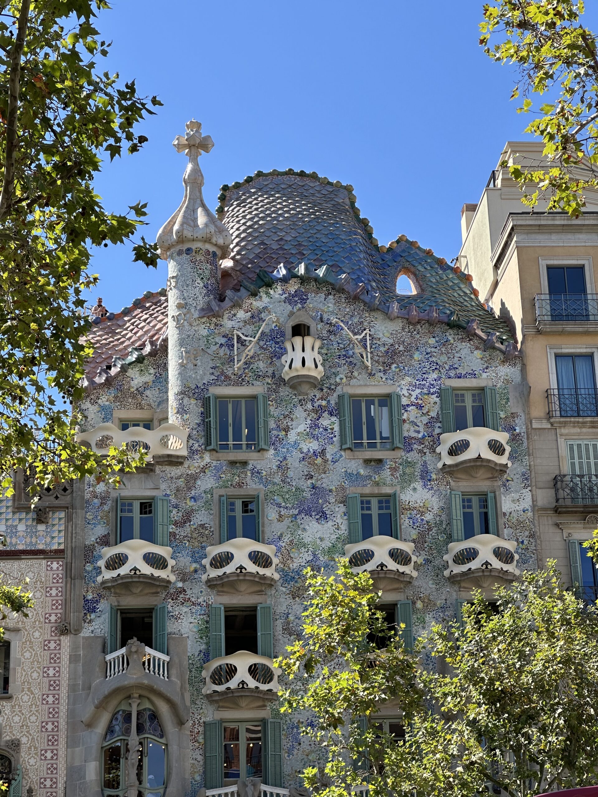 One of Gaudí’s iconic houses in Barcelona, Casa Batlló references Barcelona’s patron saint Sant Jordi (St. George) who, according to legend, slayed a dragon to protect the city. The top of the house shows the dragon stabbed by a sword, depicted by the cross, and the dragon’s victims depicted as skulls in the balconies.