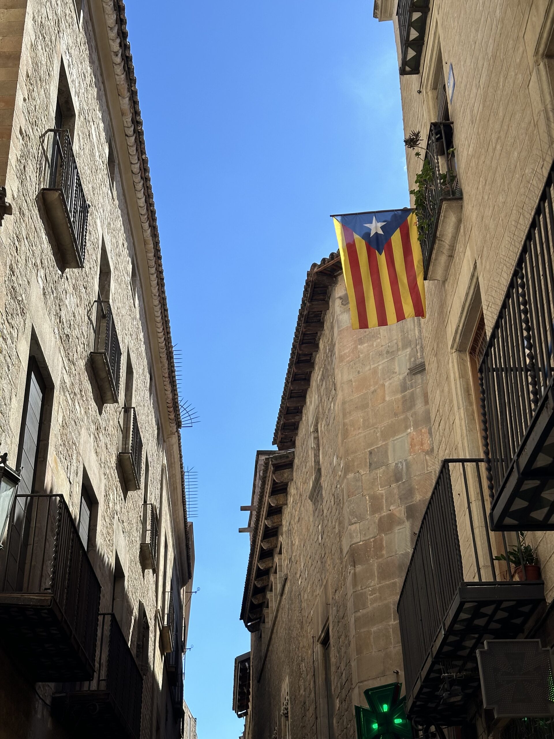 The Catalan independence flag features the traditional red and yellow stripes of Catalonia with a blue triangle and a white star, symbolizing the region’s desire for independence.