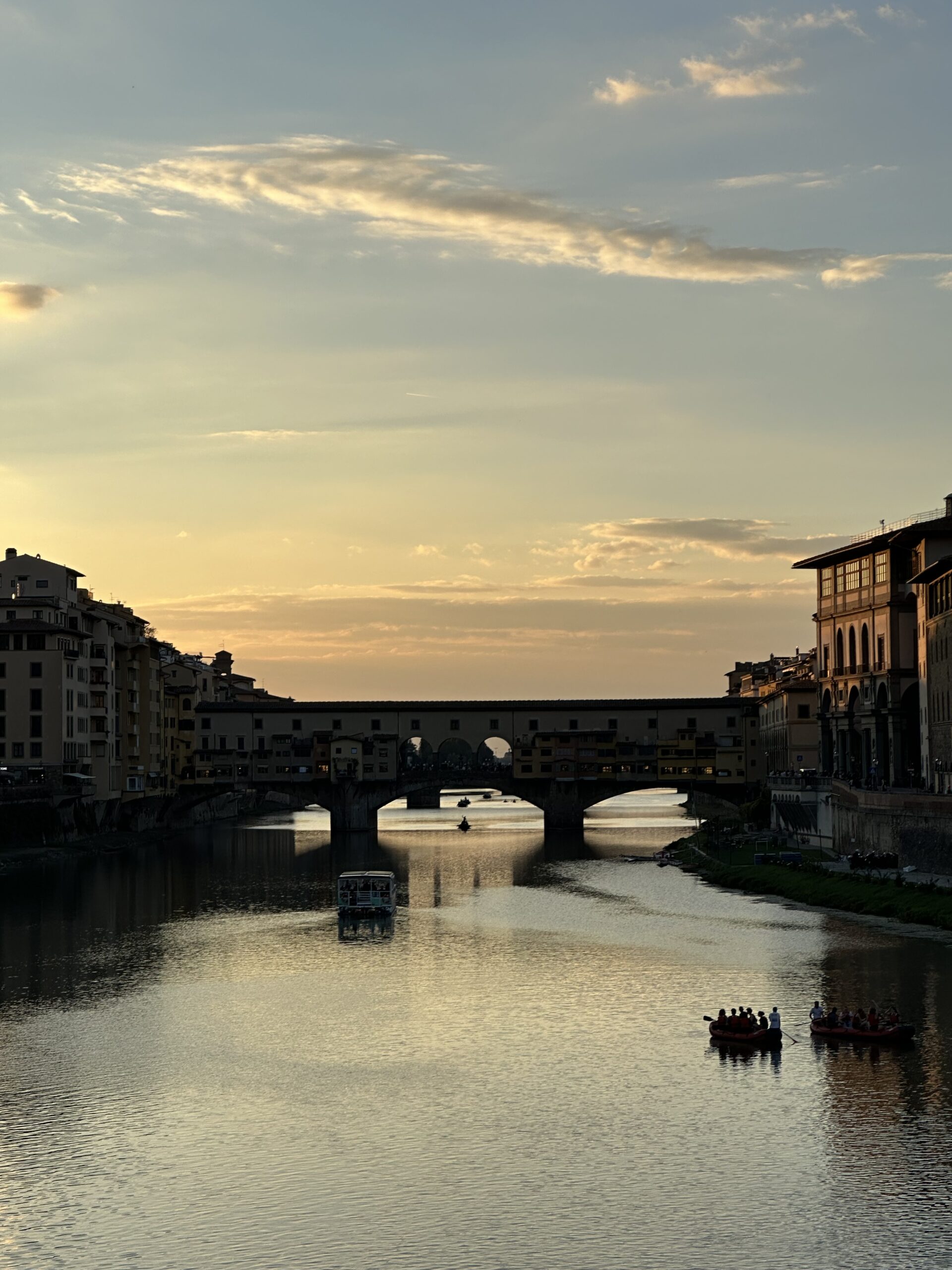The Ponte Vecchio, Florence’s oldest bridge, crosses the Arno with rows of jewelry shops. It also forms part of the elevated Vasari Corridor, connecting the Palazzo Vecchio with the Palazzo Pitti.