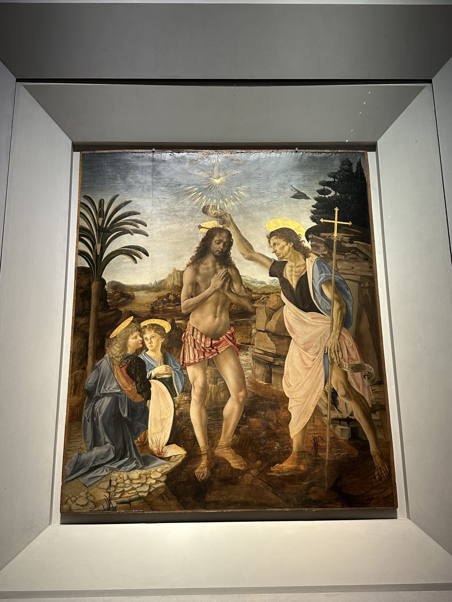 The Baptism of Christ, painted by Verrocchio with contributions from his student, the young Leonardo da Vinci.