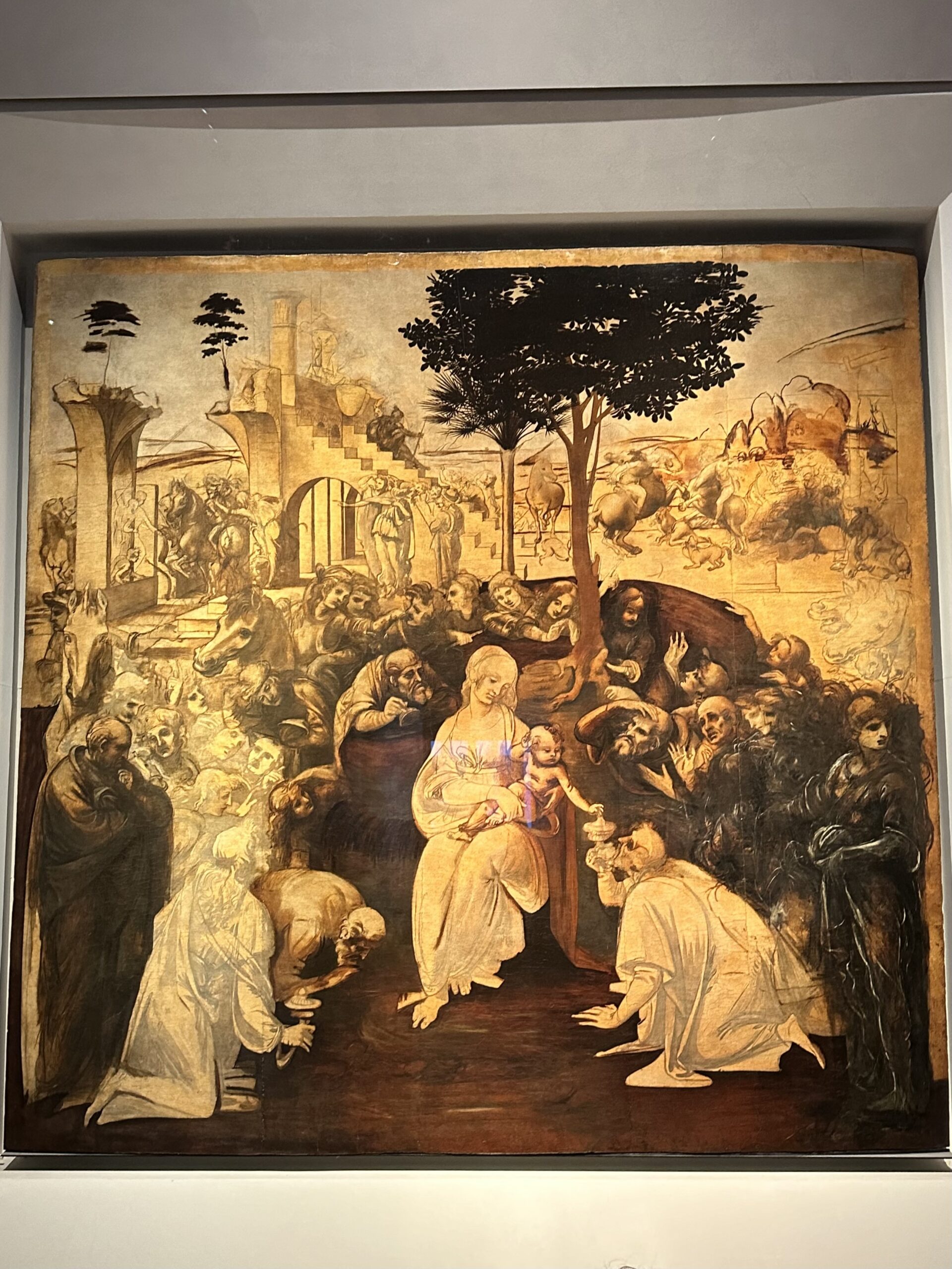 Leonardo da Vinci’s Adoration of the Magi is an unfinished painting depicting the Three Wise Men presenting gifts to the infant Jesus. It was left incomplete when Leonardo was called to Milan.